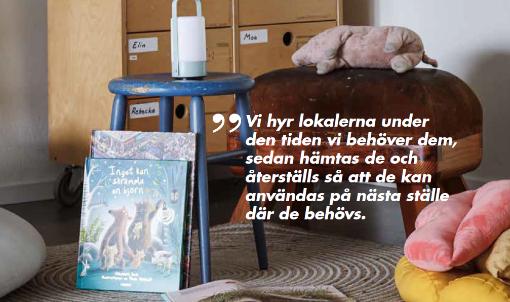 – För oss gäller det att konstatera vad det faktiska behovet är och ställa det mot kostnaderna för olika lösningar och funktioner. På det här sättet undviker vi att ta en större kostnad för att fylla ett behov som är tillfälligt. Vi hyr lokalerna under den tiden vi behöver dem, sedan hämtas de och återställs så att de kan användas på nästa ställe där de behövs. Det blir en hållbar och bra lösning för alla parter!